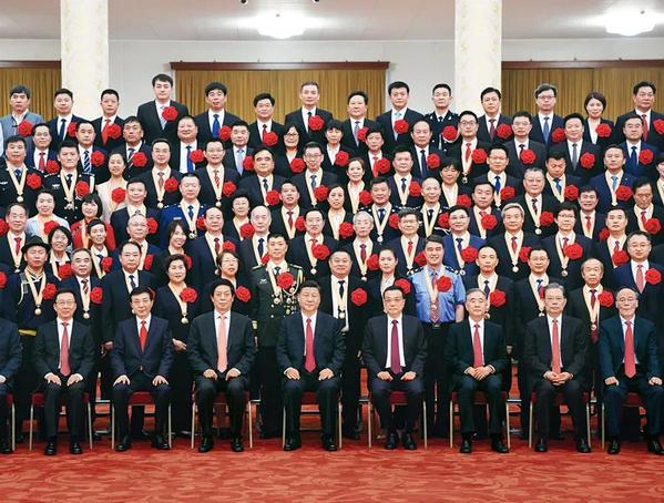 2021年6月29日,庆祝中国共产党成立100周年“七一勋章”颁授仪式在北京人民大会堂金色大厅隆重举行。习近平等领导同志在颁授仪式前会见全国“两优一先”表彰对象。新华社记者 申宏/摄